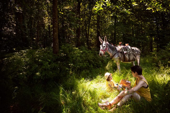La randonnée fonctionne bien avec Petite Oreille. Jusqu’à 3 ans, le porte-bébé dépannait pour les pauses, mais désormais elle marche volontiers, à condition de respecter son rythme. Certains porte-bébés conviennent aux enfants de maternelle (comme Rose & Rebellion), mais je ne les ai pas testés : en solo, il me faut aussi un sac à dos pour l’équipement photo, les affaires de ma fille, etc. Sur les sentiers, je la laisse s’arrêter pour observer, ramasser des mûres, mettre les pieds dans un ruisseau, tout devient prétexte à s’amuser. Plusieurs fois, nous avons randonné avec un âne, ce qui l’a ravie : deux jours en Sarthe, à tenir Coco par la longe, à câliner l’animal pendant les pauses. Elle aurait pu continuer des jours ainsi !