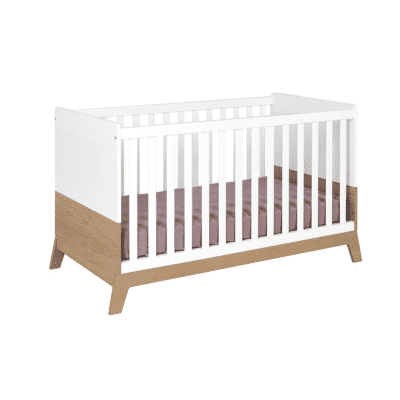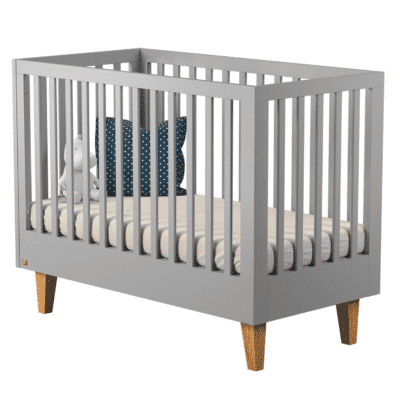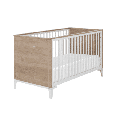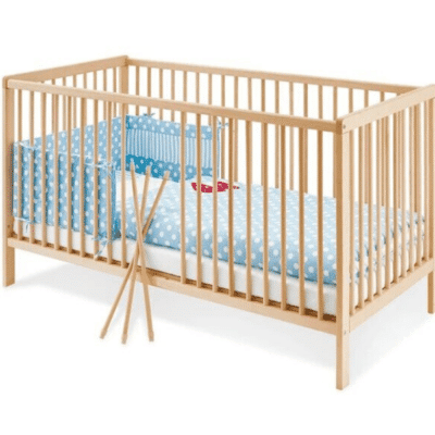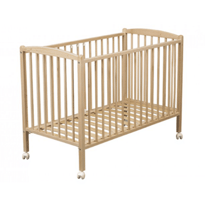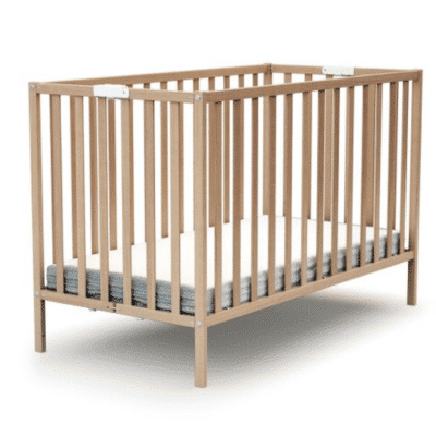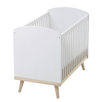 Combelle, expert en mobilier en bois, propose un lit bébé standard (60 x 120 cm) simple et efficace. Fabriqué en hêtre massif, il dispose d’un sommier à lattes courbes réglable sur quatre hauteurs. Les roulettes pivotantes équipées de freins facilitent le déplacement, tandis que les côtés à barreaux arrondis rappellent la solidité et le soin apportés à la sécurité. Tout cela à un tarif accessible, autour de 150 euros.